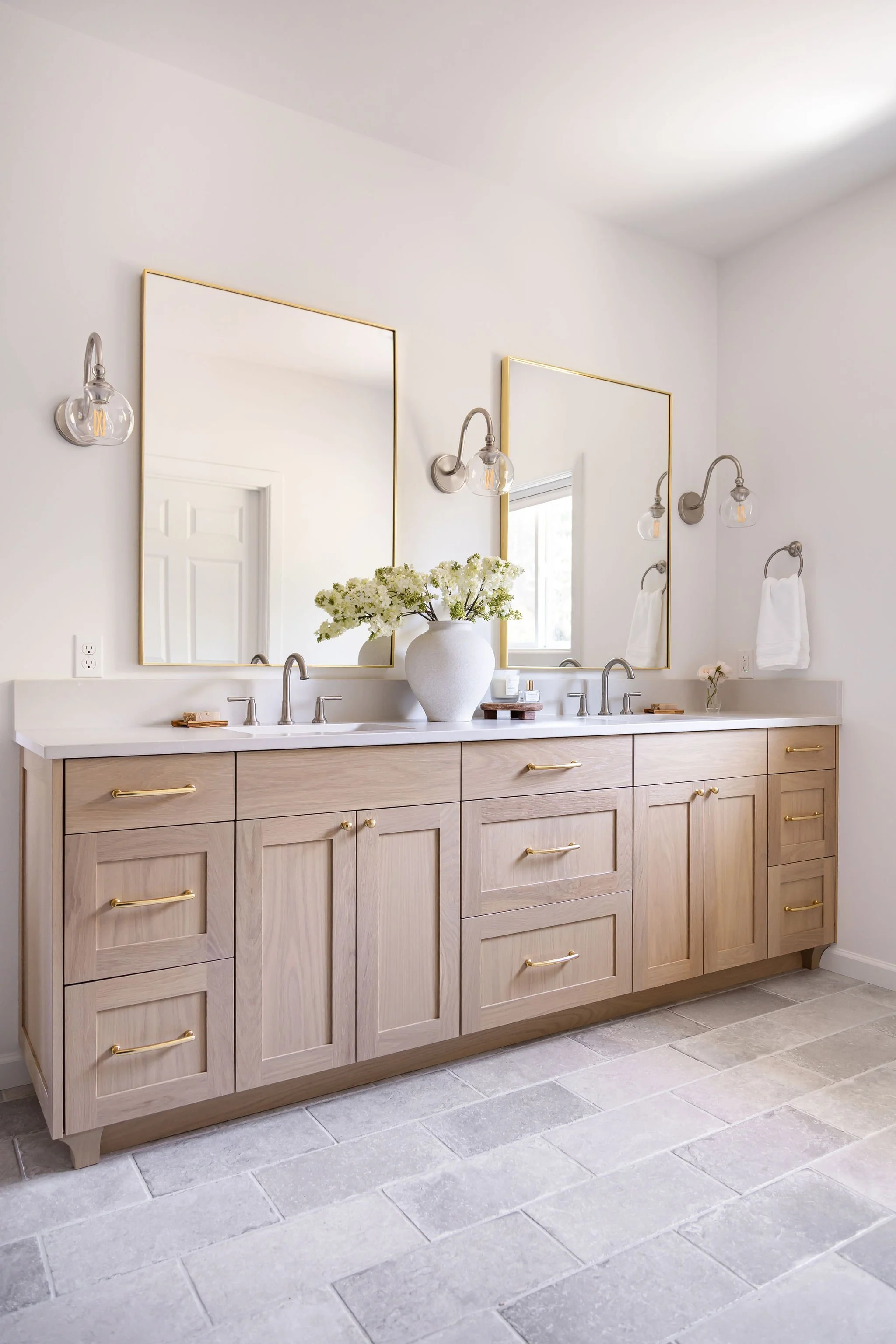 Bathroom vanity with two mirrors, flower vase, and lighting fixtures.